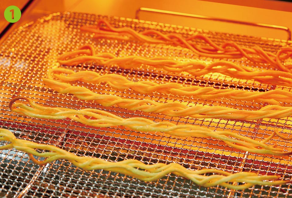 (1)トースターにスティック状にねじった沖縄そばをくっつかない様にのせ、こげない程度に焼く(1200wで7~8分)。 |